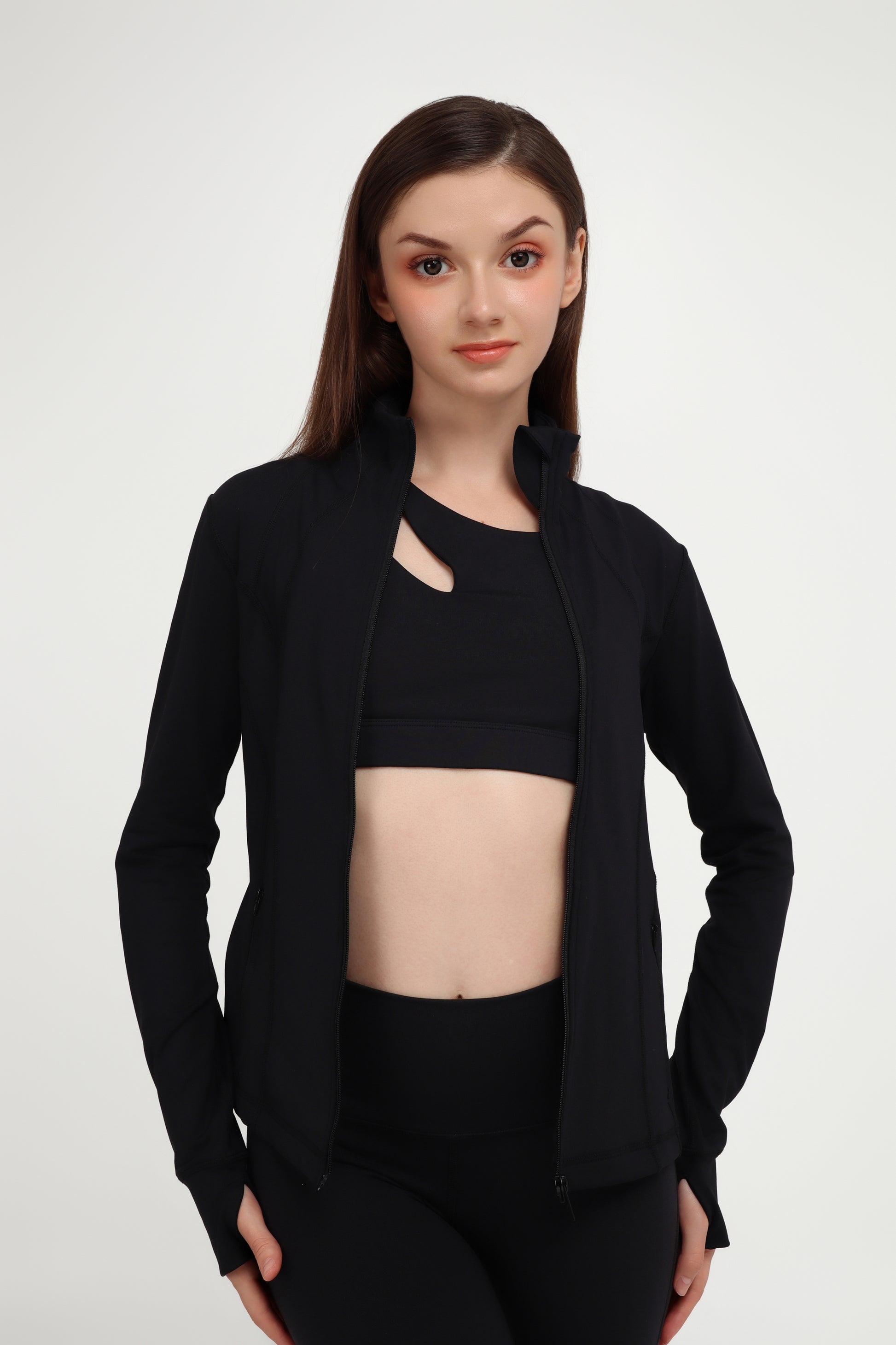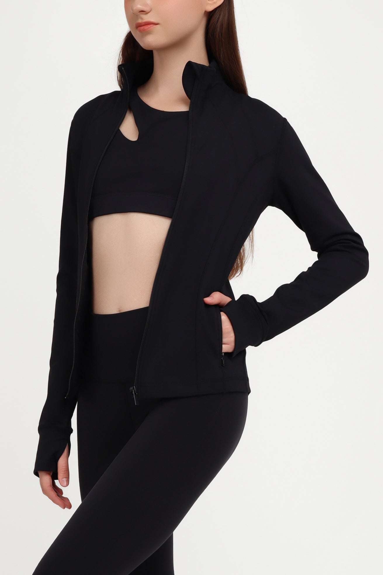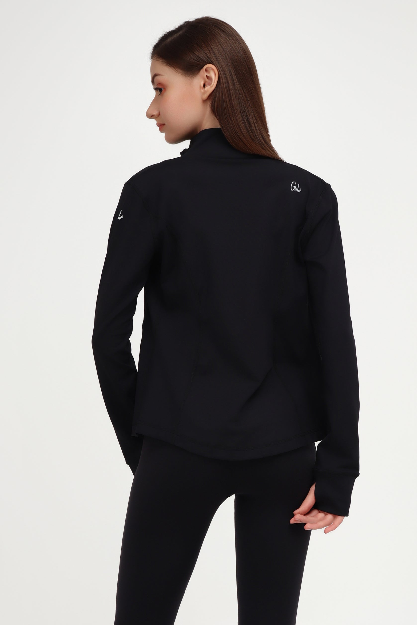 Breathable, cotton-y fabric takes on perfect form in this full-zip, full length performance jacket. With a ribbed collar, fold-over arm cuffs & thumbholes, it’s the perfect companion for outdoor activities, light flows, and everyday look.